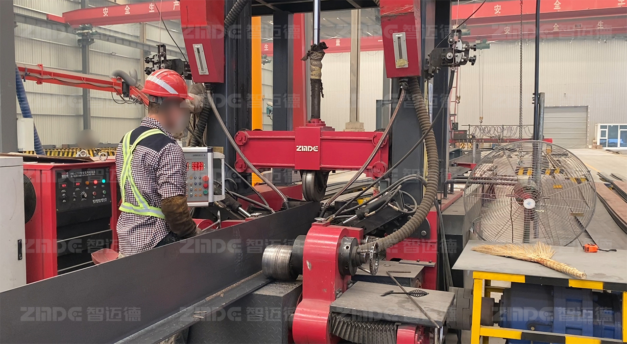 而组焊矫一体机的出现,打破了这一困境。组焊矫一体机创新性地将组立、焊接、矫正三道工序集成在一台设备上,仅需1~2人即可操作。设备设计精密、高度集成,通过智能化控制系统,提升钢结构加工的精准控制,并且可自动对中,无需点焊,腹板18mm以下免坡口焊接,采用热焊热矫工艺,从头焊到尾,在提高生产效率的同时,有效提升了钢构件的产品品质。与此同时,搭配智迈德“乌骓”六极六弧焊机的组焊矫一体机可实现薄板、厚板的焊接,并可选配智迈德“绝影”三极三弧焊机,实现焊接效率的大幅度提升。