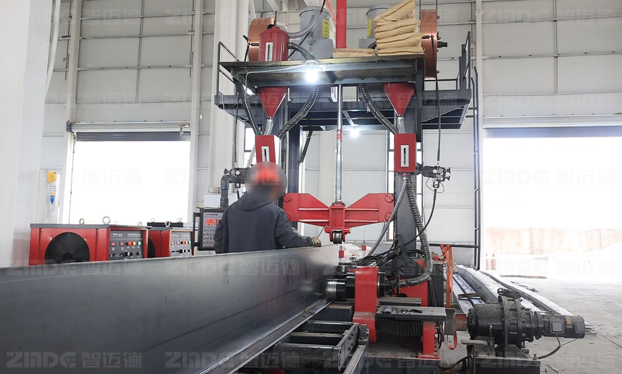 与传统的钢结构加工模式不同,组焊矫一体机将组立、焊接、矫正三道钢结构生产的关键工序,集成在一台设备上,通过精密、集成的设计和智能化控制系统,能够实现整个过程的自动化、智能化生产。设备仅需1~2人即可完成操作,可自动对中,无需点焊,腹板18mm以下免坡口焊接,采用热焊热矫工艺,从头焊到尾,提高了生产效率,提升了钢构件的加工精度和品质。与此同时,可选配智迈德自研新型焊机,满足各类板材的焊接需求,提升焊接效率与焊接品质。